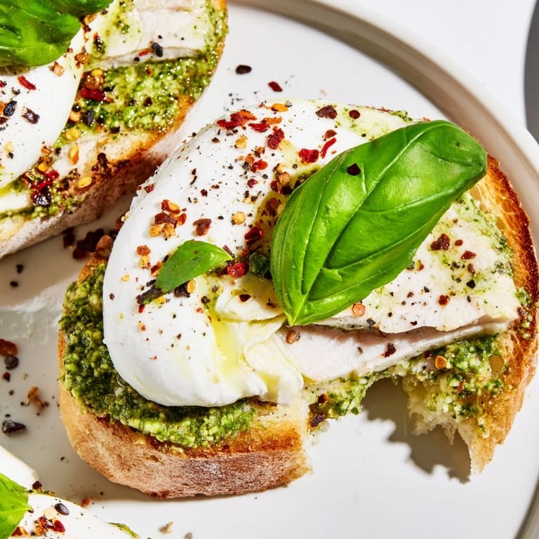 - Spread 1 tablespoon pesto on each toasted slice then layer the warm chicken slices on top. Tear the burrata in half and place one half on each toast letting the creamy center spill over slightly.