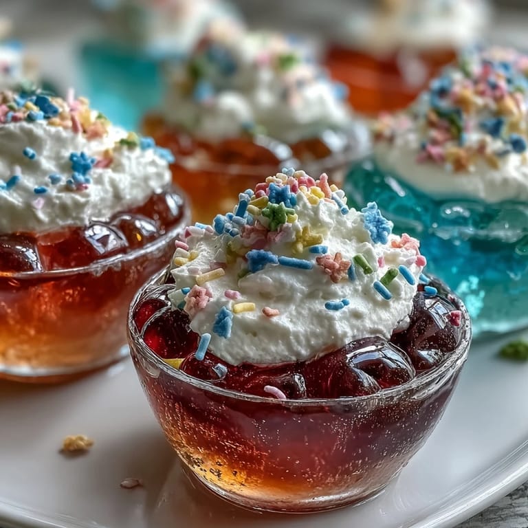 When we served these rainbow Jello cups at my nephew's birthday, every face at the table broke into a smile. Even the grown-ups vied for one, joking about who got the tallest layers and whose cup had the best sprinkle design. It was a noisy, joyful moment—a rare instance where dessert was actually a group activity, not just the sweet finish. There were messy fingers and whipped cream moustaches, but not a single cup was left behind. In retrospect, it was the simplest dessert that brought the biggest energy to the party.