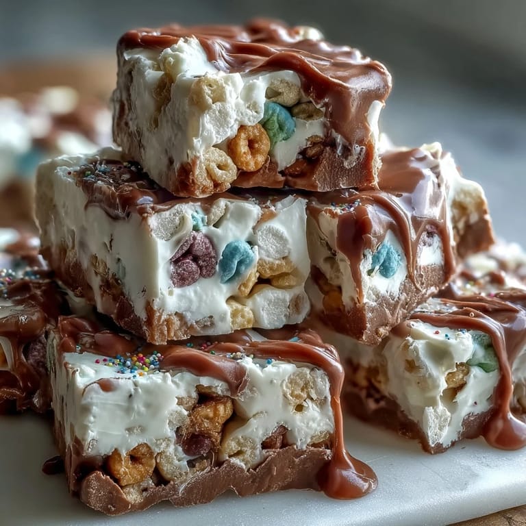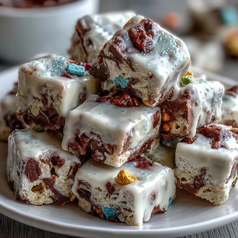 White chocolate chips are melted gently, spread evenly on parchment, then topped with Lucky Charms cereal and marshmallows. After drizzling green candy melts and sprinkling edible glitter, it’s chilled to set and broken into serving pieces.