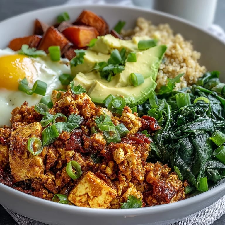 Save The first time I made this bowl, I was trying to convince my roommate that vegan breakfast could be satisfying, not just virtuous. She watched skeptically as I scrambled that block of tofu with turmeric and paprika, the skillet filling with this golden, savory aroma that actually smelled like breakfast. By the time I'd roasted the sweet potatoes until their edges caramelized and fluffed up that fluffy quinoa, something shifted in her expression. She took one bite and didn't say much, just kept eating until the bowl was empty.